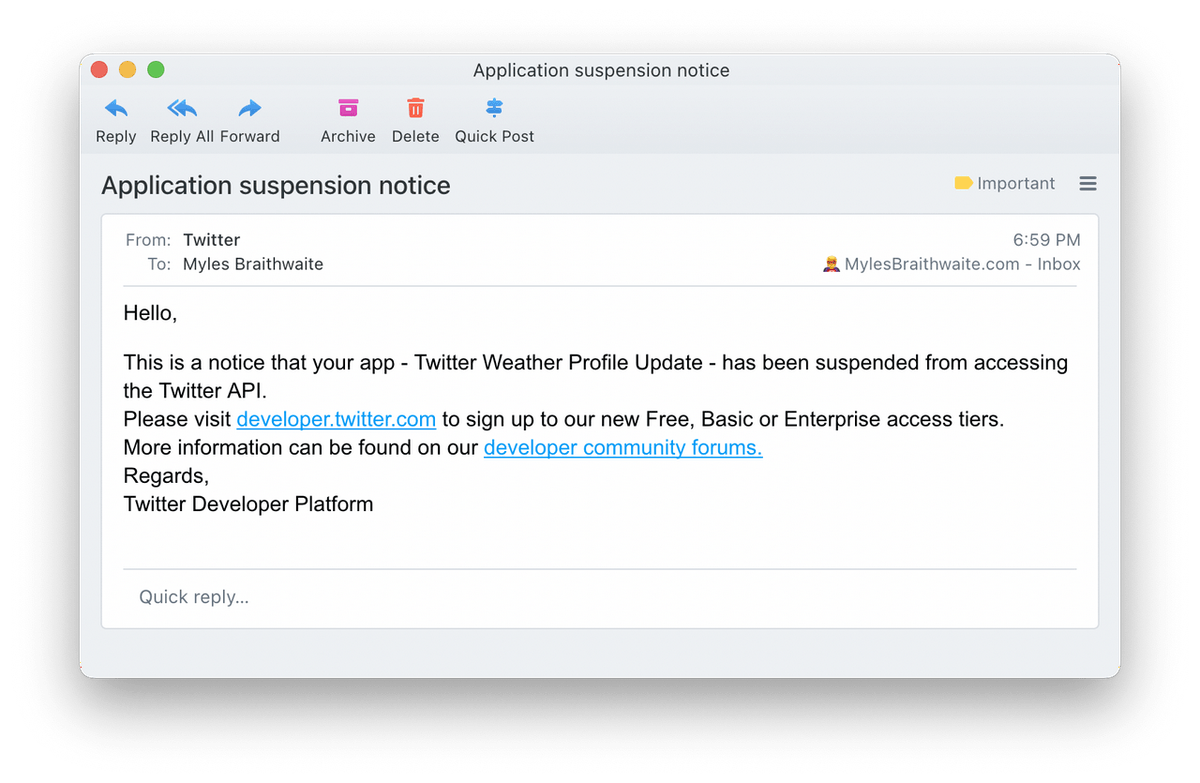 Today, I received an email from the Twitter Developer Platform, informing me that my bot was suspended from accessing the Twitter API. I tried to appeal the decision, but the web form kept giving me an error.